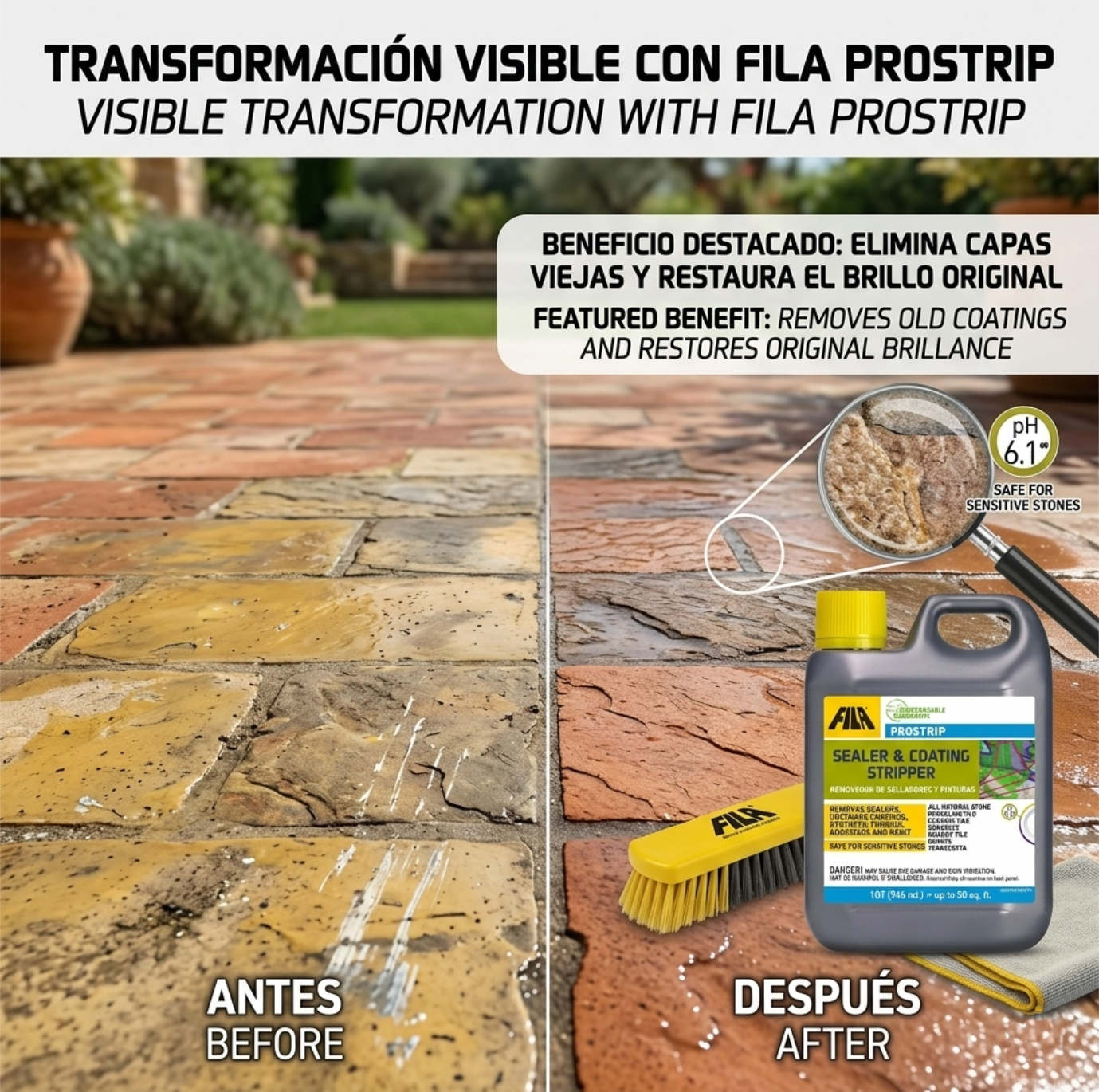 No Daña el Material: A diferencia de los ácidos, es seguro para piedras naturales delicadas (como mármoles o calizas pulidas) siempre que se use en la dilución adecuada.