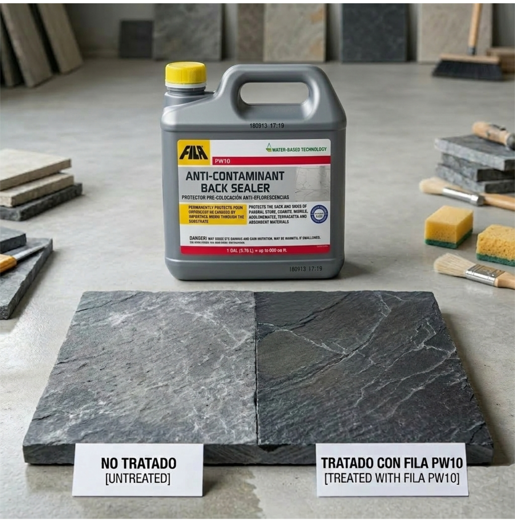 Muchas veces, las manchas en el mármol o granito después de instalados no son por suciedad externa, sino por la humedad del piso que sube con sales. El FILA PW10 es el «seguro de vida» para cualquier proyecto de piedra natural, garantizando que el material se mantenga impecable con el paso de los años.